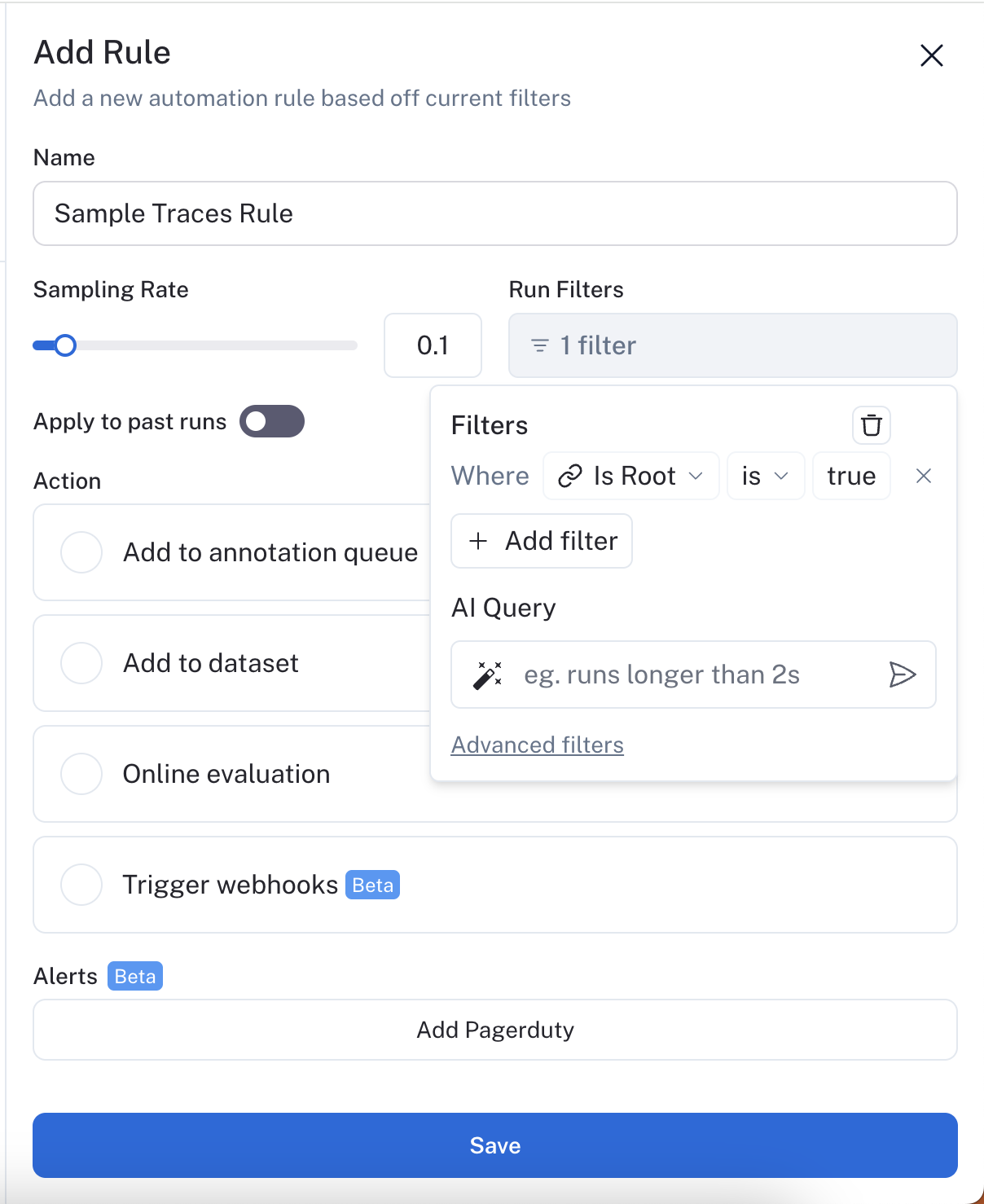 Therefore, to make sure we have the proper sampling rate on traces, we can add a filter condition to only match the "root" run in the run tree. This is distinct per trace, so our 10% sampling will upgrade 10% of traces, rather 10% of runs, which could correspond to more than 10% of traces.