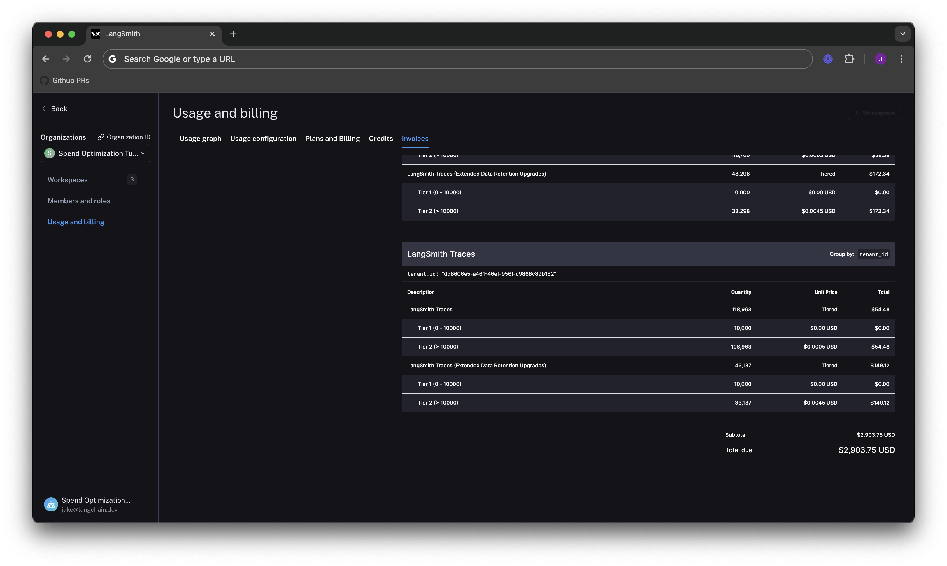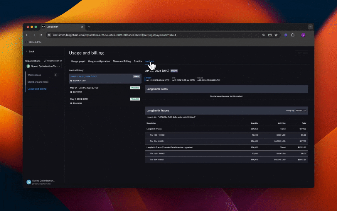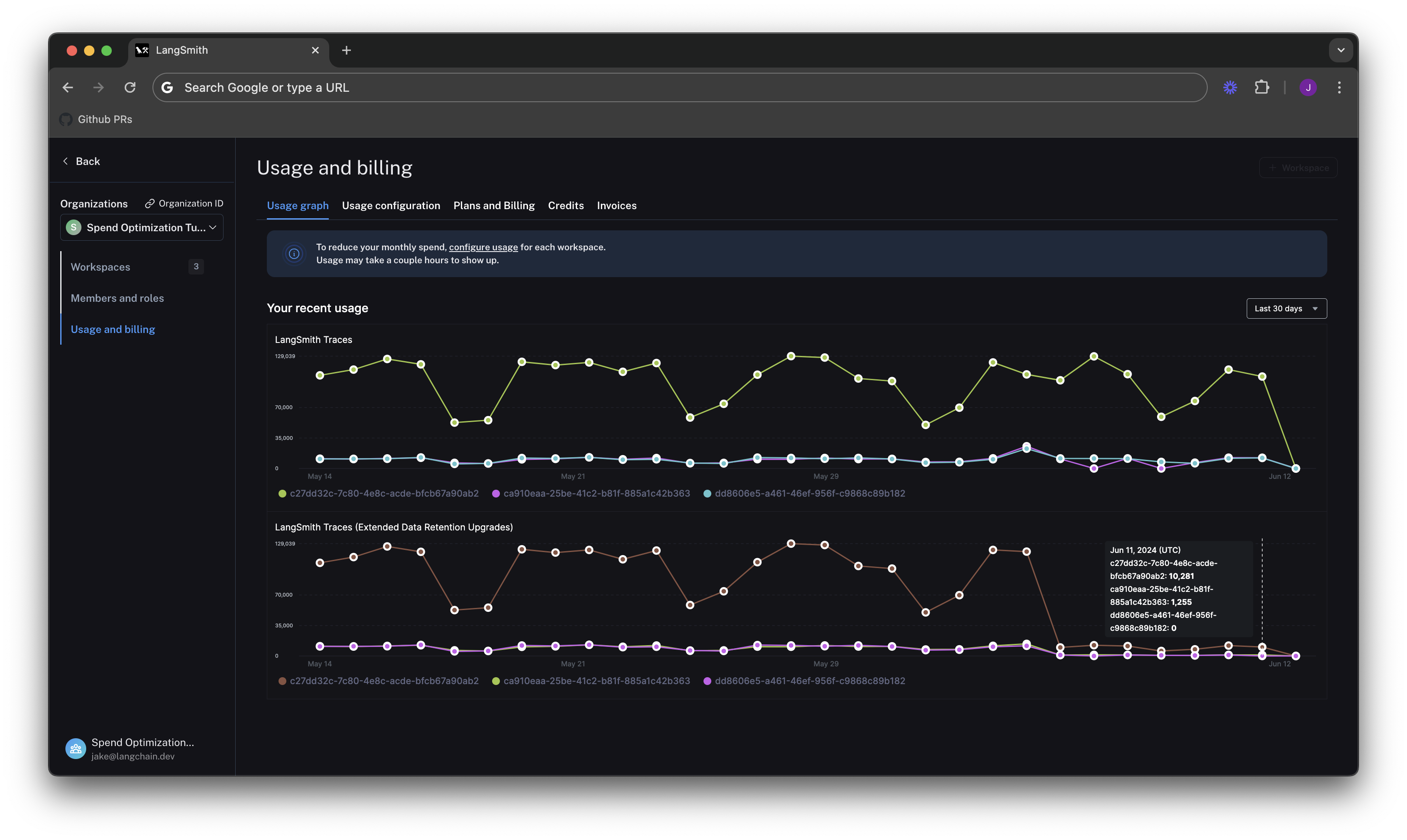The first step of any optimization process is to understand current usage. LangSmith gives two ways to do this: Usage Graph and Invoices.