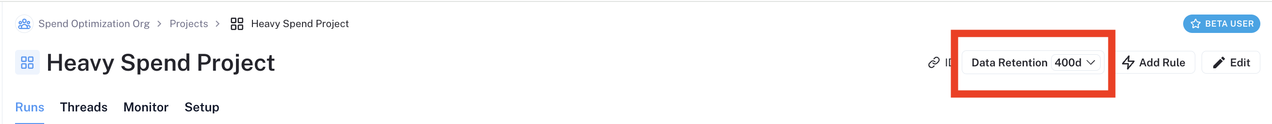 We navigate to Projects -> <your project name>, click the data retention drop down, and modify it to base retention. As