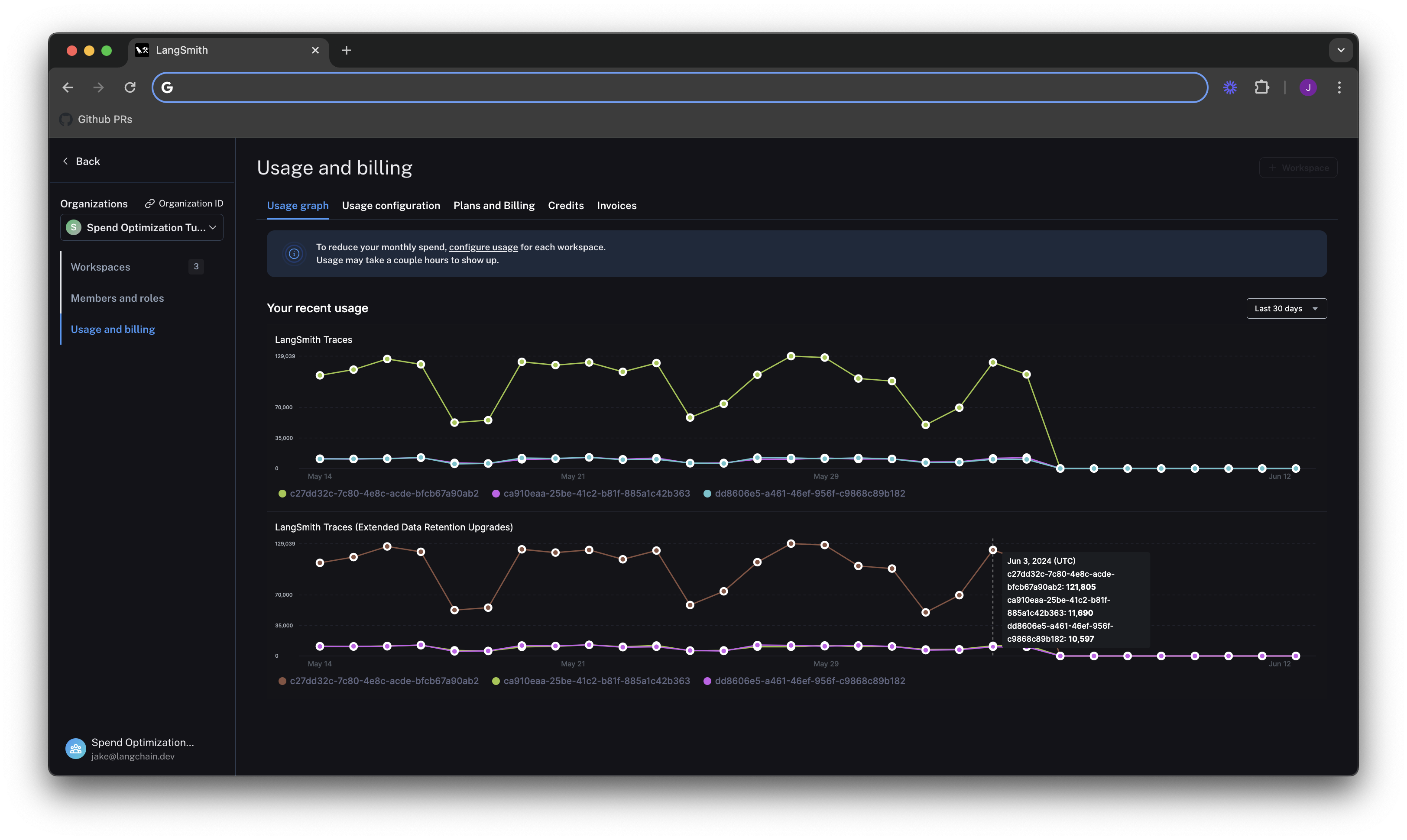 In the above GIF, we see that the charges for LangSmith Traces are broken up by "tenant_id" (i.e. Workspace ID), meaning we can track tracing spend on each of our workspaces. In the first few days of June, the vast majority of the total spend of ~$2,000 is in our production workspace. Further, the majority of spend in that workspace was on extended data retention trace upgrades.