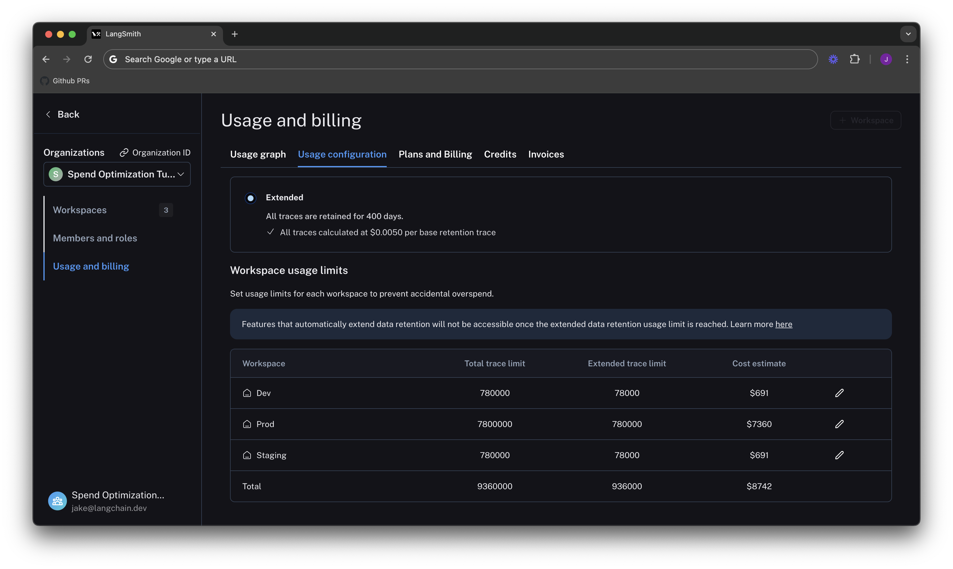 Now that our limits are set, we can see that LangSmith shows a maximum spend estimate across all workspaces: