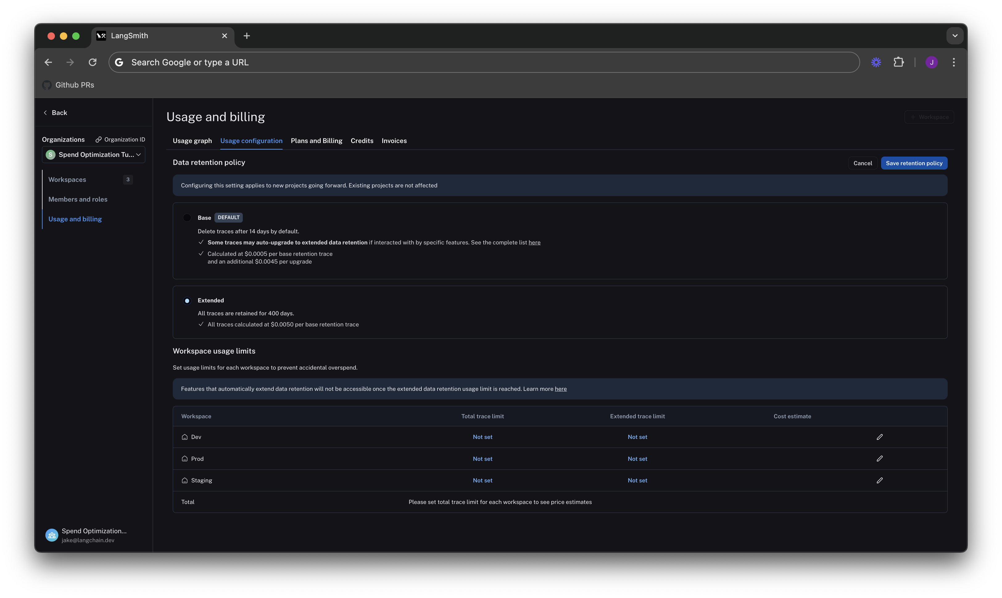 LangSmith has two usage limits: total traces and extended retention traces. These correspond to the two metrics we've been tracking on our usage graph. We can use these in tandem to have granular control over spend.