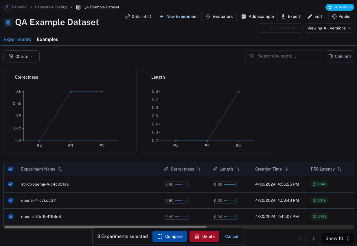 Awesome, we've evaluated three different runs. But how can we compare results? The first way we can do this is just by looking at the runs in the Experiments tab. If we do that, we can see a high level view of the metrics for each run: